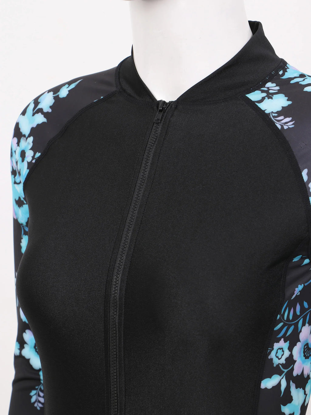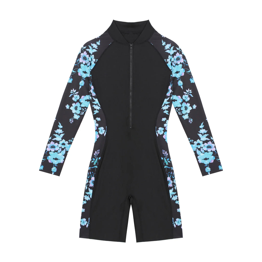 Women Long Sleeve Front Zipper Floral Geometric Pattern Print One-piece Swimming Jumpsuit.